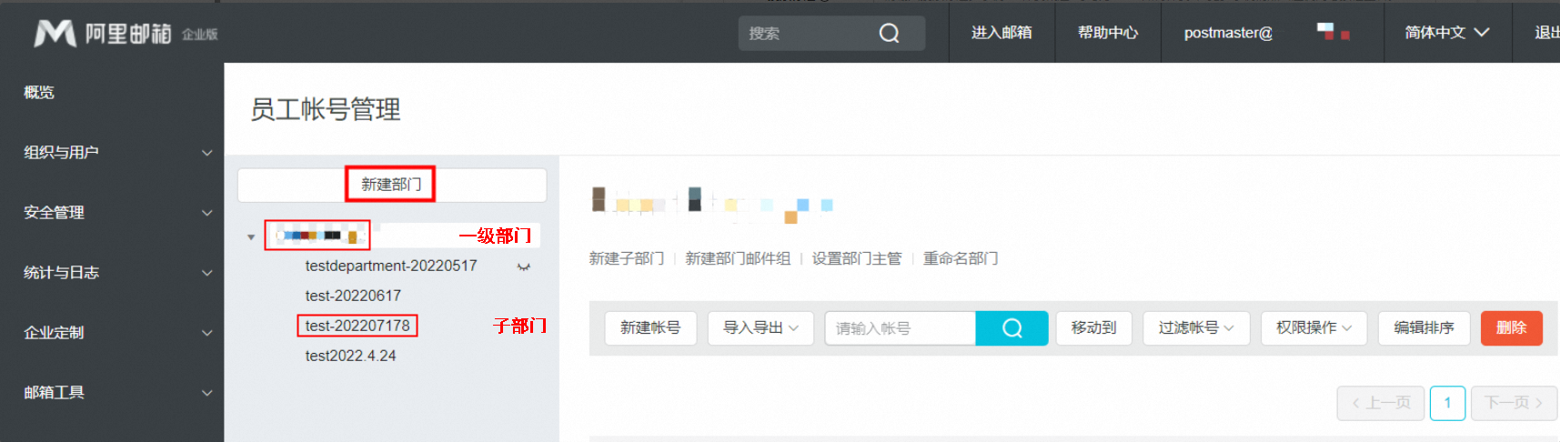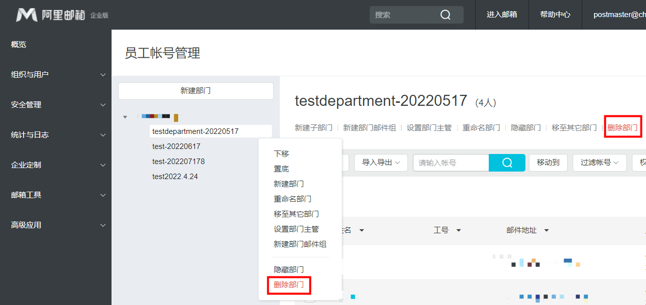 方法一:使用管理員postmaster賬號登錄進入域管后臺>>點擊組織與用戶>>點擊郵箱管理>>選中對應的一級部門(子部門)>>點擊刪除部門即可。