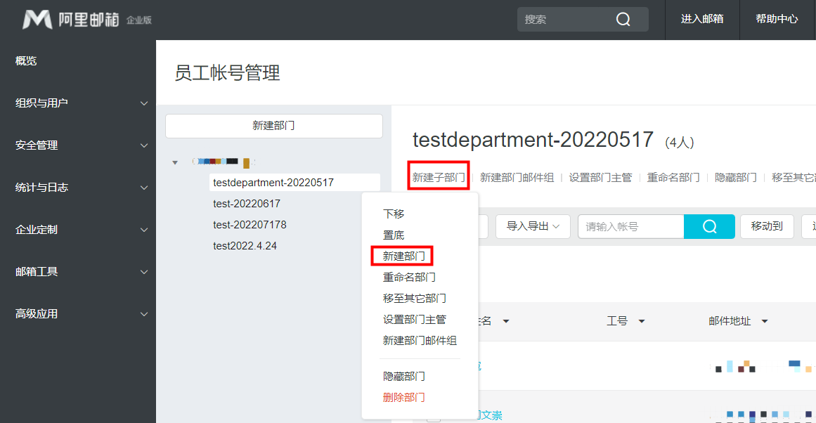 方法一:使用管理員postmaster賬號登錄進入域管后臺>>點擊組織與用戶>>點擊郵箱管理>>選中對應的一級部門>>點擊新建子部門,即可在該部門下建立一個子部門郵箱。